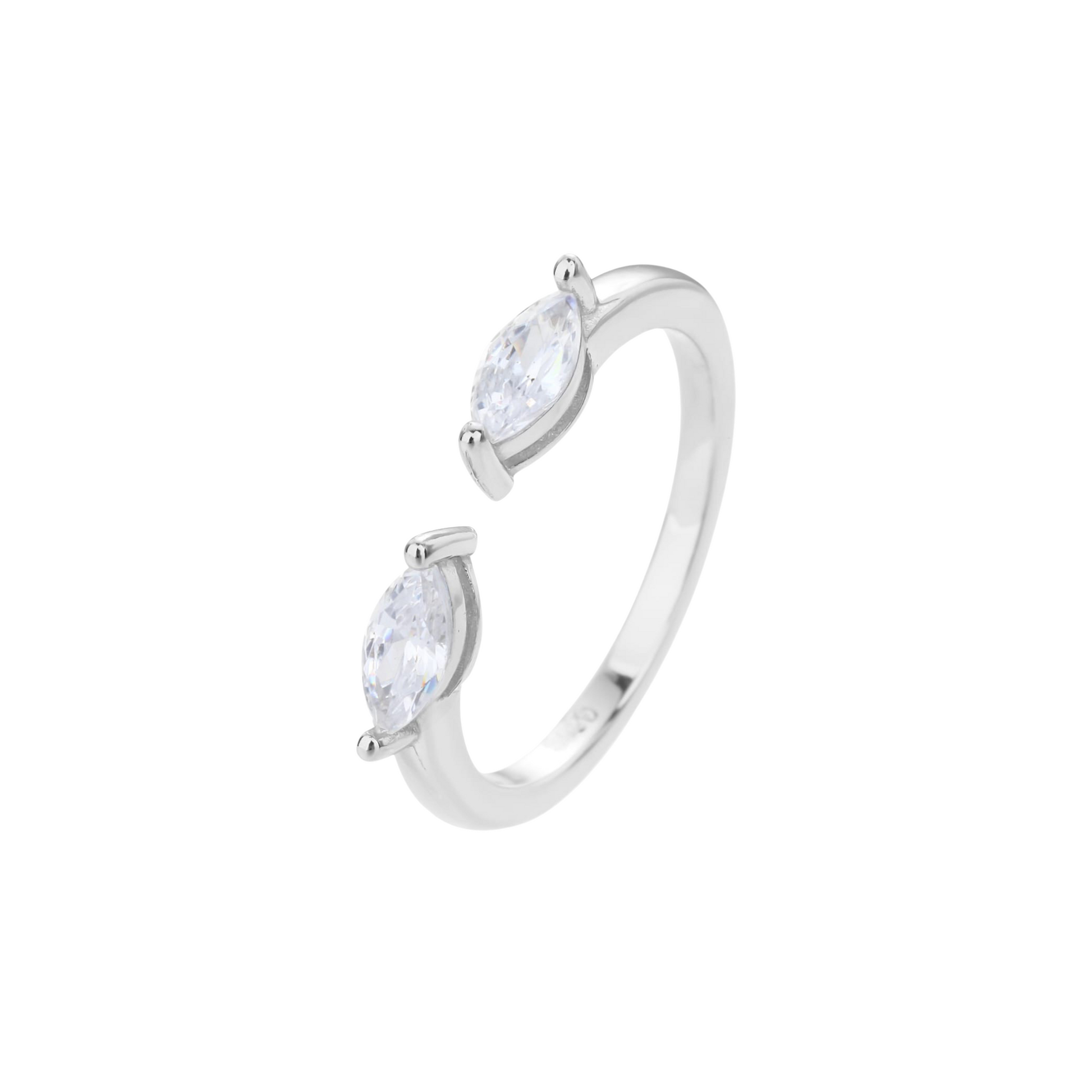 טבעת כסף 925 לזרת פתוחה עם שני שיבוצים נוצצים בצורת טיפה, הטבעת מלאה בנוכחות מתאימה ליום יום או לאירועים מיוחדים