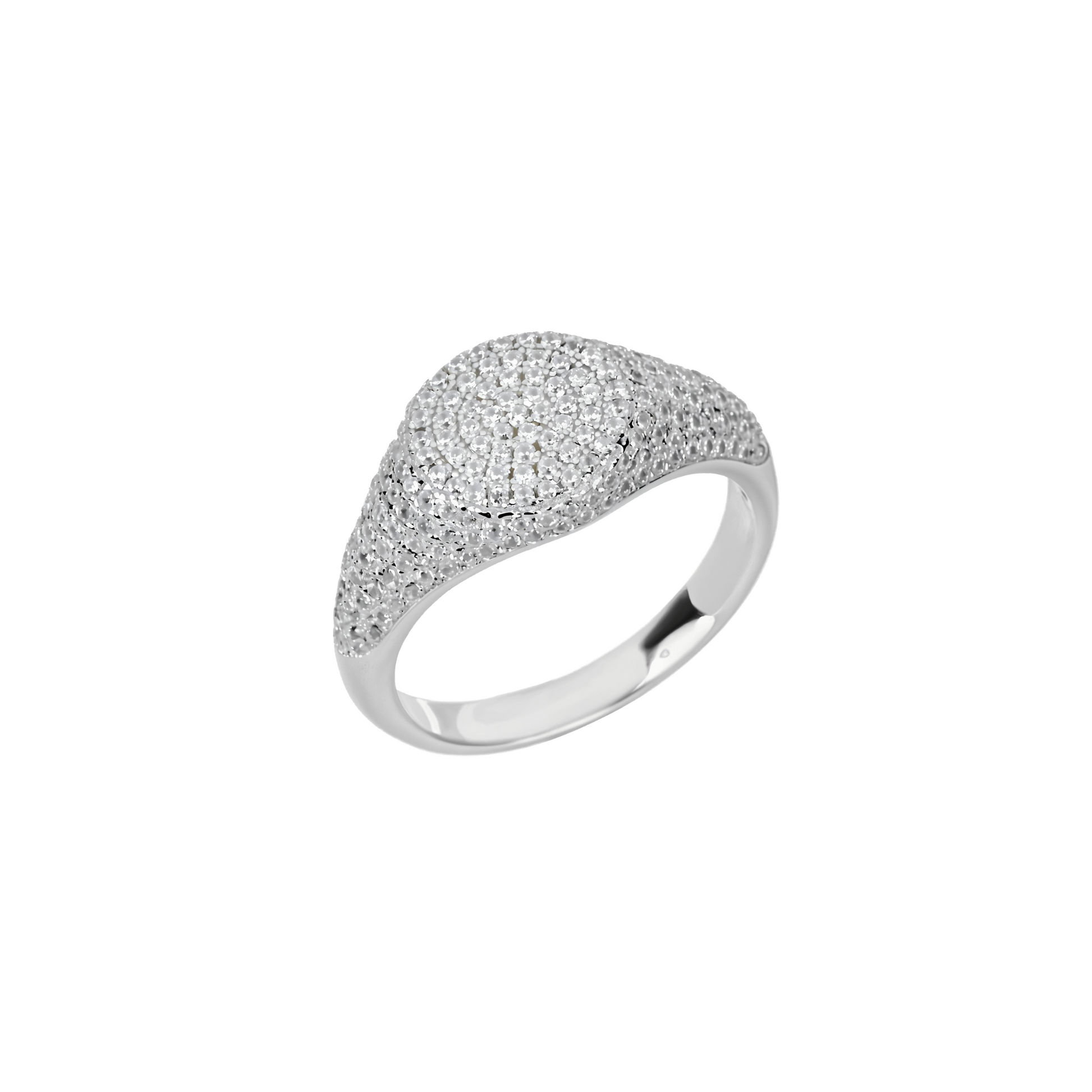 טבעת עגולה כסף טהור 925 בעיצוב חלק ונקי, משובצת זרקונים קטנים שמקיפים אותה כמו הילה זוהרת